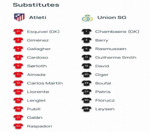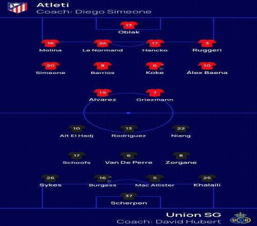 北京时间11月5日4点,欧冠联赛阶段,马德里竞技对阵圣吉罗斯联合,赛前公布首发名单。