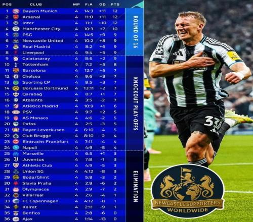 欧冠联赛阶段第4轮,纽卡主场2比0毕尔巴鄂,丹·伯恩首开纪录,若埃林通锁定胜局,托纳利当选MVP。喜鹊3胜1负排名第6,与巴黎、利物浦、皇马同分。 本季欧冠英超球队8次出战西甲球队,以7胜1负占压倒性优势。纽卡的胜利宣告英超6支欧冠参赛队本轮5胜1平的强势。在前4轮24场比赛中,英超球队17胜4平3负,在前4、前8、前10、前12均占半壁江山。其中阿森纳(4胜)、曼城(3胜1平)、热刺(2胜2平)保持不败。阿森纳进11球失0球,与拜仁并列榜首,下轮两队将直接对话。